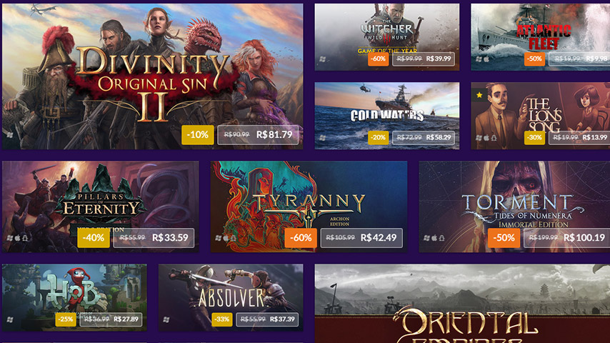 Com promoções que alteram diariamente, o primeiro dia traz Torment: Tides of Numenera por R$59,89, The Witcher III: The Wild Hunt Game of The Year Edition por R$39,99, e clássicos como Jagged Alliance 2 por R$7,89 ou o pacote Commandos 2+3 por R$2,89.