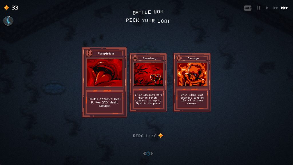 O conceito funciona muito melhor na prática do que eu imaginava. A minha partida com a demo, que está disponível para download no Steam, foi com o “King of Nothing”. Ele começa com tropas simples, mas assim que venci algumas batalhas, fui capaz de obter cartas demoníacas. O campo de batalha era dominado pelos meus soldados e demônios com “vampirismo” – praticamente invencíveis.