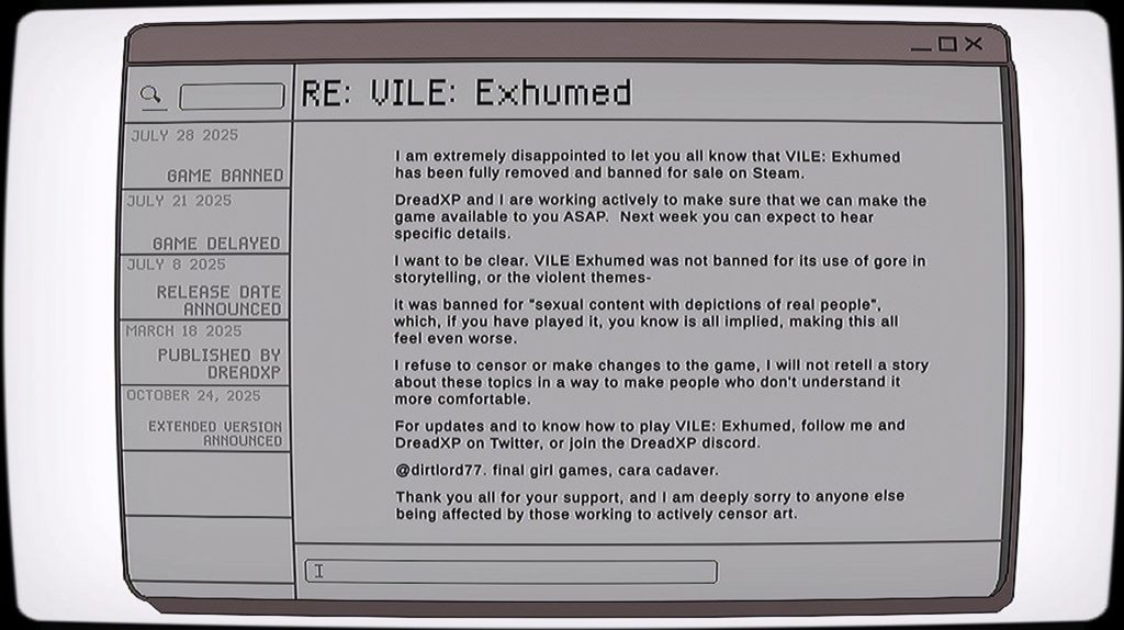 Em nota, a Publisher DreadXP e a desenvolvedora Final Girl Games anunciaram nesta segunda-feira (28) que o adventure “VILE: Exhumed” – até então previsto para sair via Steam, mas adiado pela build não ser aprovada pela Valve – foi banido da plataforma.