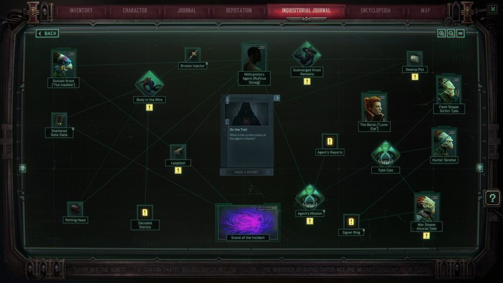Outras mudanças de “Dark Heresy” incluem um novo sistema de investigação que requer mais exploração do cenário, interrogação com os personagens presentes na cena de um crime ou utilizar um sistema de dedução. E, como você é um inquisidor, as pessoas reagirão de forma muito mais intensa às suas ações e isso será refletido de forma mais notável no cenário.