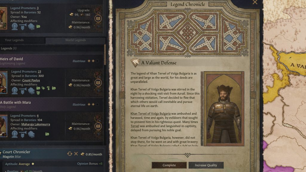 O sistema em si também não é tão intuitivo ou natural quanto eu gostaria. Comparado com a naturalidade de hospedar torneios ou fazer viagens com sua corte, a interface das lendas cria um distanciamento do roleplay de “Crusader Kings 3”. Algo como “aqui está um novo sistema com que você vai interagir ocasionalmente, mas não se preocupe se não interagir, nada de mal vai acontecer”. Também não vi a IA tentar estabelecer as suas próprias lendas — o que eu esperava, considerando que “Crusader Kings 3” já tem sistemas bem poderosos para isso: o de religião e de culturas divergentes.