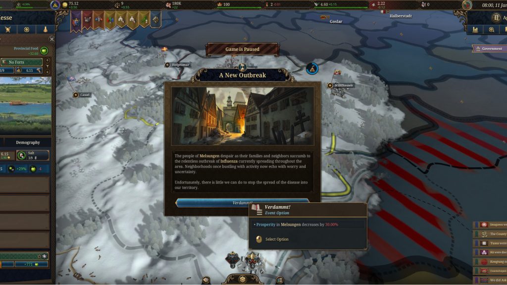 É menos um jogo de estratégia onde você olha para um local do mapa, marcha um exército e toma controle como se fosse nada, e mais um processo que você tem que levar dezenas de fatores em consideração. Iniciar um conflito sem ter uma considerável reserva de ouro e uma economia forte pode – e vai – implicar em consequências desastrosas. Ou, no meu caso, se enfiar no meio de uma cruzada na qual você não tem nada a ver.