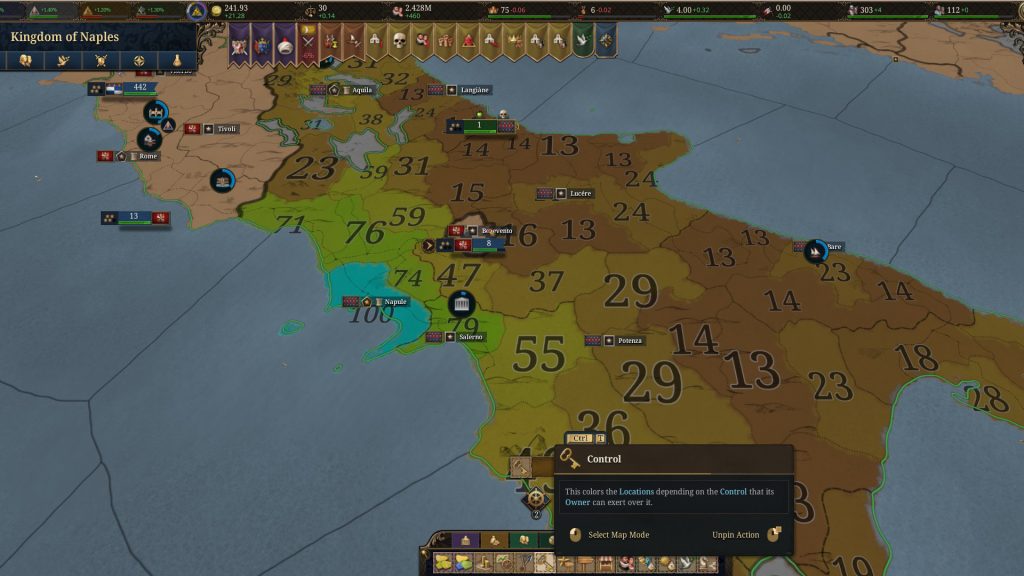 Mas, para mim, Nápoles estava “longe” de tais dores de cabeça – ao menos de início – e eu tinha tantos problemas para resolver que era difícil pensar sobre o que a França e a Inglaterra estavam fazendo. Apesar de ter um forte mercado na região, Nápoles tem pouquíssimo controle sobre as províncias que não estão próximas da capital. Isso significa menor arrecadação de taxas, menor quantidade de bens produzidos, e maior chance de revolta de grupos da população descontentes com o meu reinado.