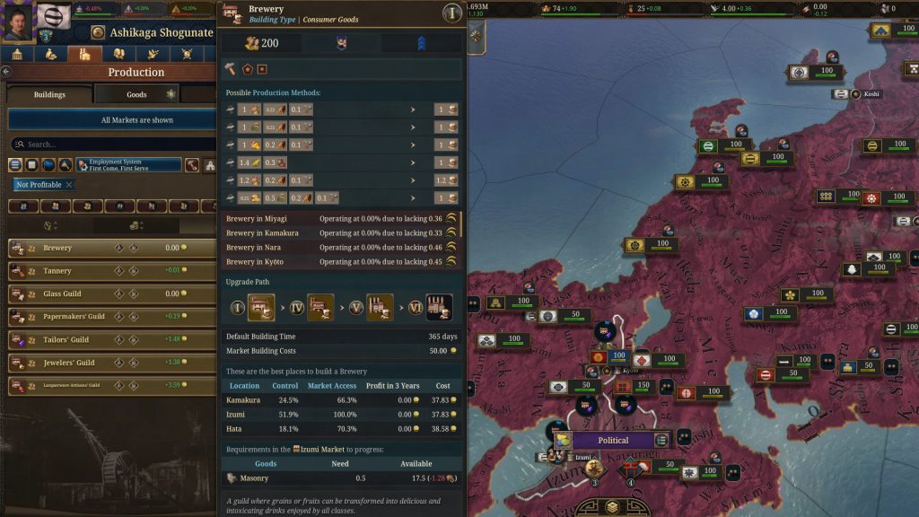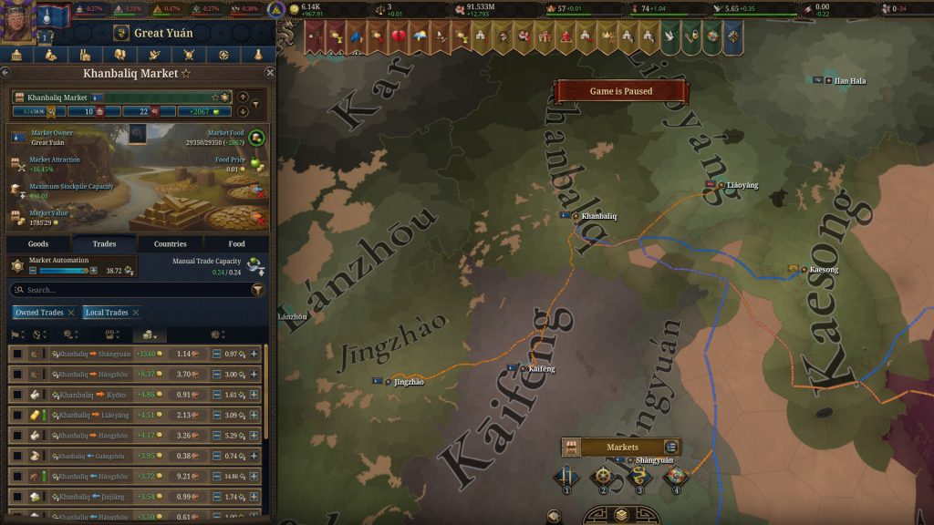 Eu queria muito dizer que eu entendi o sistema de mercado de “Europa Universalis V”, mas mesmo após mais de 60h, eu ainda luto para entender as dezenas de nuances. Ele é extremamente dinâmico e opera não só com base na oferta e demanda, mas é afetado por eventos migratórios, doenças ou desastres naturais.