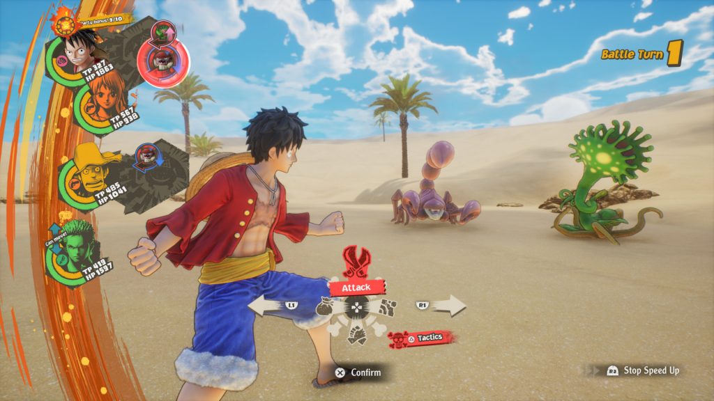 Ainda que seja um tremendo “arroz com feijão” de progressão linear tal como o restante do jogo em termos de obtenção de habilidades – impossibilitando a criação de builds específicas ou uso de táticas diferenciadas – as batalhas são dinâmicas, não tomam tempo demais e sempre são dignas de representar “One Piece” no geral.