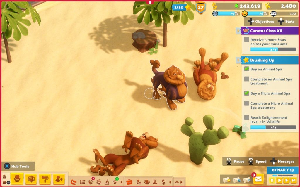 Digo “quase natural”, pois, antes de você começar o DLC você vai ter que se preparar um pouco para ler uma boa dose de tutoriais sobre as novas mecânicas. A desenvolvedora já havia feito isso em “Fantasy Finds”, mas se nele ela parecia um pouco “apressada” em fazer você aprender tudo o mais rápido possível, “Zooseum” tem uma cadência mais leve, de fato focada em fazer com que você entenda cada mecânica e aspecto crucial para construir e gerenciar um santuário de animais ao invés de te fazer chegar nas duas (das cinco) estrelas — número mínimo para determinar que um cenário está “concluído”.