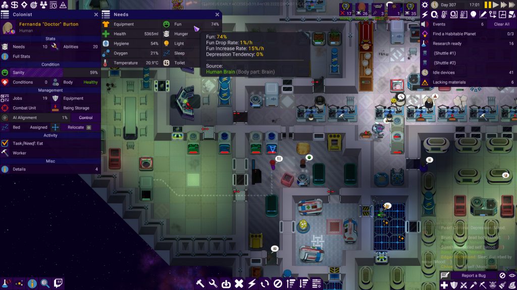 Para quem já tem mais experiência com o jogo, como é o meu caso, a maior adição vai ser o sistema de combate consideravelmente melhorado. Ainda que não seja o foco de “Stardeus”, agora todos os humanos, robôs e alienígenas possuem partes específicas do corpo que podem ser danificadas ou arrancadas durante o combate. Aqueles que morreram, bem, ao menos seus órgãos vão poder ser vendido no mercado. Sim, “Stardeus” está virando um daqueles jogos.