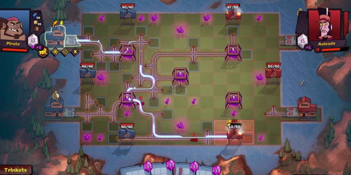 Para complicar as coisas, toda vez que você ataca ou é atacado, parte dos trilhos é destruída. Ou seja, você precisa pensar e repensar como reconstruí-los de forma que o seu trem seja mais rápido a chegar na base do inimigo, ou fazer com que o trem do inimigo demore ainda mais tempo para te causar dano.