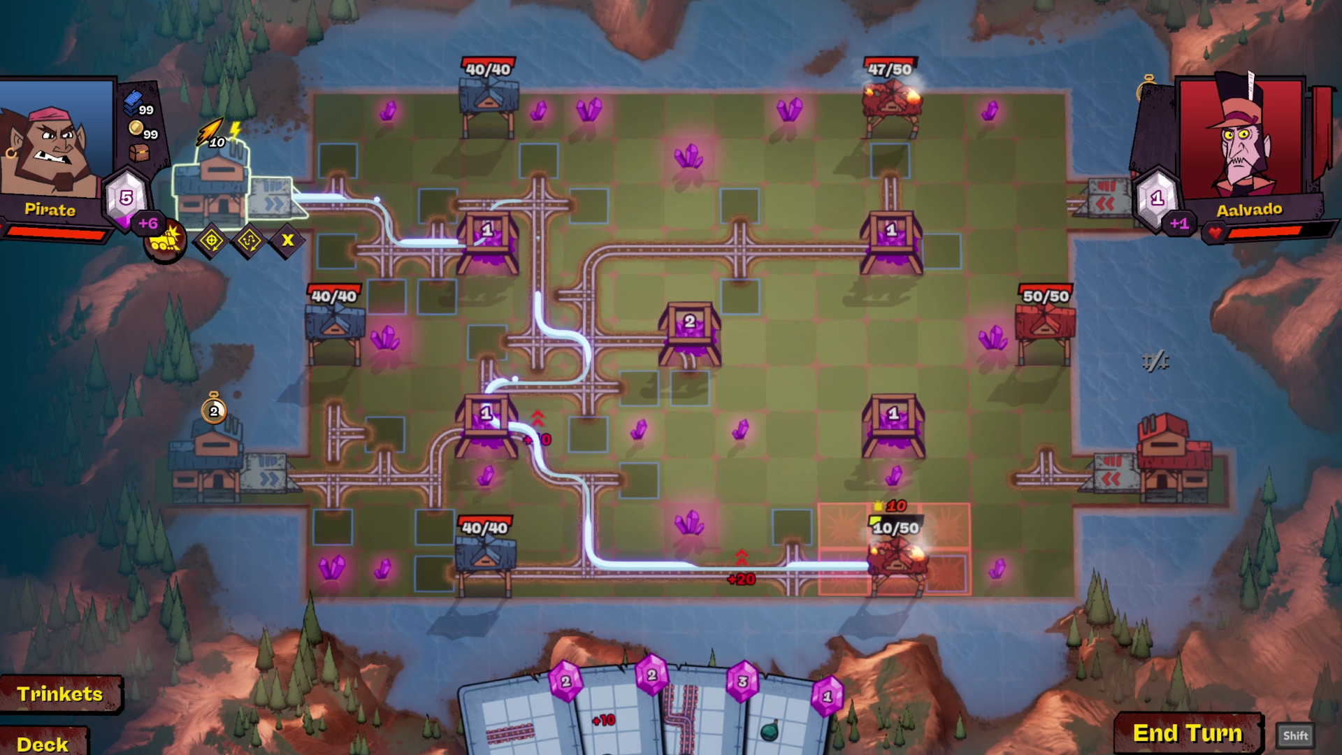 Para complicar as coisas, toda vez que você ataca ou é atacado, parte dos trilhos é destruída. Ou seja, você precisa pensar e repensar como reconstruí-los de forma que o seu trem seja mais rápido a chegar na base do inimigo, ou fazer com que o trem do inimigo demore ainda mais tempo para te causar dano.