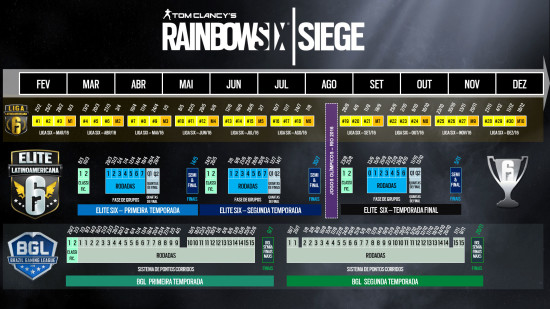 Já a Elite Six, ou Elite Latinoamericana de Rainbow Six, terá três temporadas, em março, maio e agosto. As oito melhores equipes da Liga Six terão sua vaga garantida, enquanto as outras oito vagas serão definidas por uma etapa classificatória.