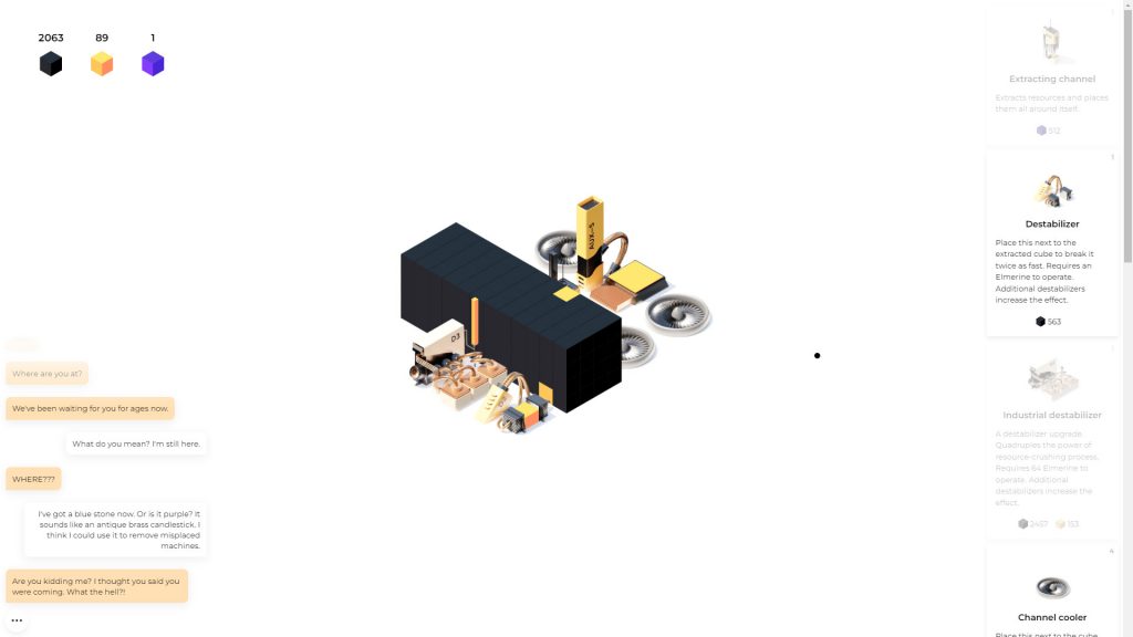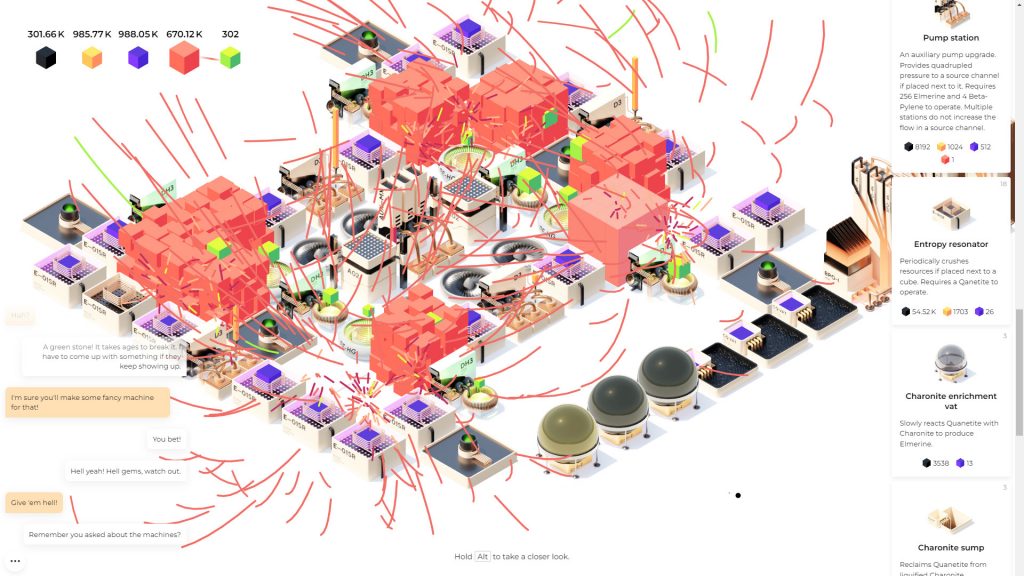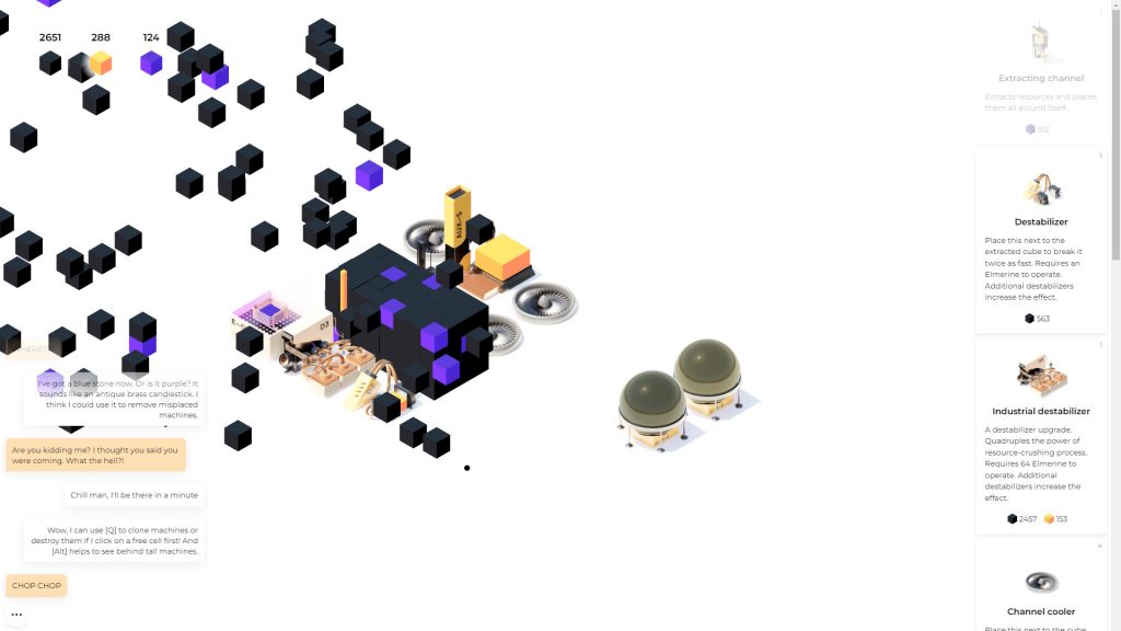 O loop de gameplay lembra bastante o de Factorio e de jogos similares. Você cria máquinas básicas para obter cubos, depois máquinas para refiná-los. No fim, você tem toda uma linha de produção e ainda ter que lutar contra uma entidade chamada “The Darkness”.