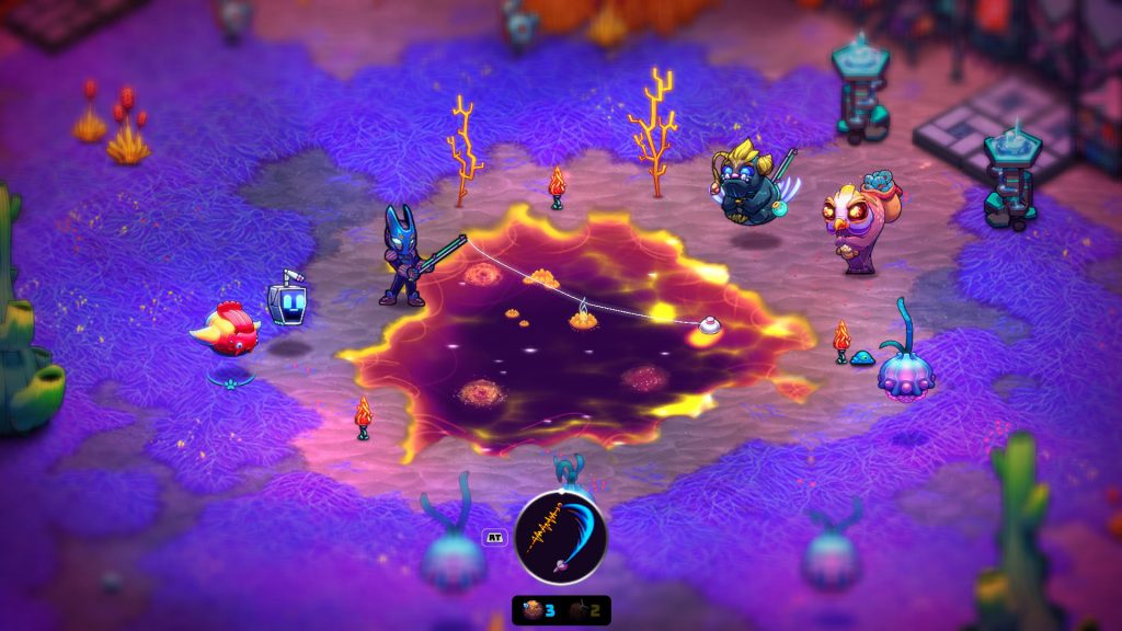 Por falar em combate, a sequência o expande com novos tipos de equipamentos e armamentos… peculiares. Uma lança “tradicional” vira uma lança com uma luva de boxe em “Crashlands 2”. O motivo? Nem eu sei.