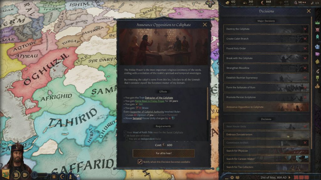 Tal como “Fate of Iberia”, ele se foca em uma região ou tema e expande as suas mecânicas. No caso é o declínio do Califato Abássida e quais medidas podem ser tomadas para sua “ressurreição” ou a criação de um novo califato.