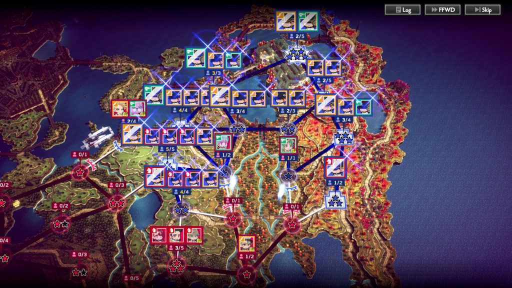 Em termos práticos isso significa um jogo que possui múltiplas camadas. A camada estratégica permite que você, recrute, movimente e batalhe contra tropas pelo controle de cidades. O combate nessa etapa – ao menos quando se trata de tropas “inferiores” – é automatizado. Vence quem tiver a maior quantidade de dano.