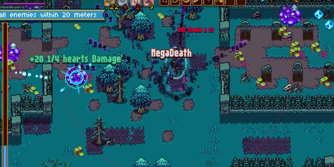Parte shooter com uma visão top-down, parte roguelite, “Death by Scrolling” se assemelha quase a um shmup. Você precisa estar em constante movimento já que a tela vai lentamente subindo. Se você não conseguir avançar ou derrotar os inimigos, e estiver na parte inferior, você é eliminado.