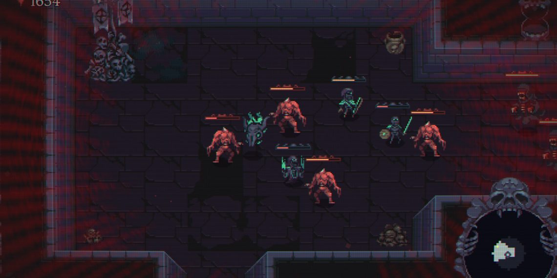 Em suma, você é um necromante que, obviamente controla uma horda de esqueletos e deve explorar dungeons em busca de loot, tesouros e mais corpos para o seu exército. A 8BitSkull tenta diferenciar “Skull Horde” de outros jogos do estilo com bastante ênfase na criação de diferentes builds e uma vasta variedade de classes.