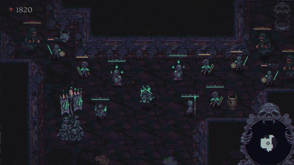Em suma, você é um necromante que, obviamente controla uma horda de esqueletos e deve explorar dungeons em busca de loot, tesouros e mais corpos para o seu exército. A 8BitSkull tenta diferenciar “Skull Horde” de outros jogos do estilo com bastante ênfase na criação de diferentes builds e uma vasta variedade de classes.