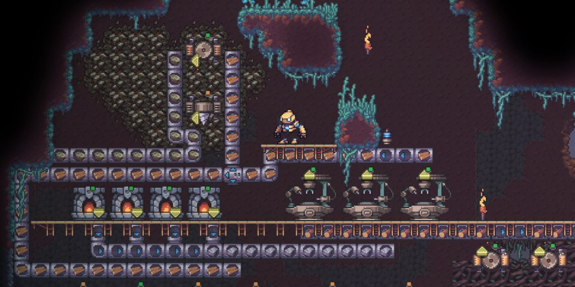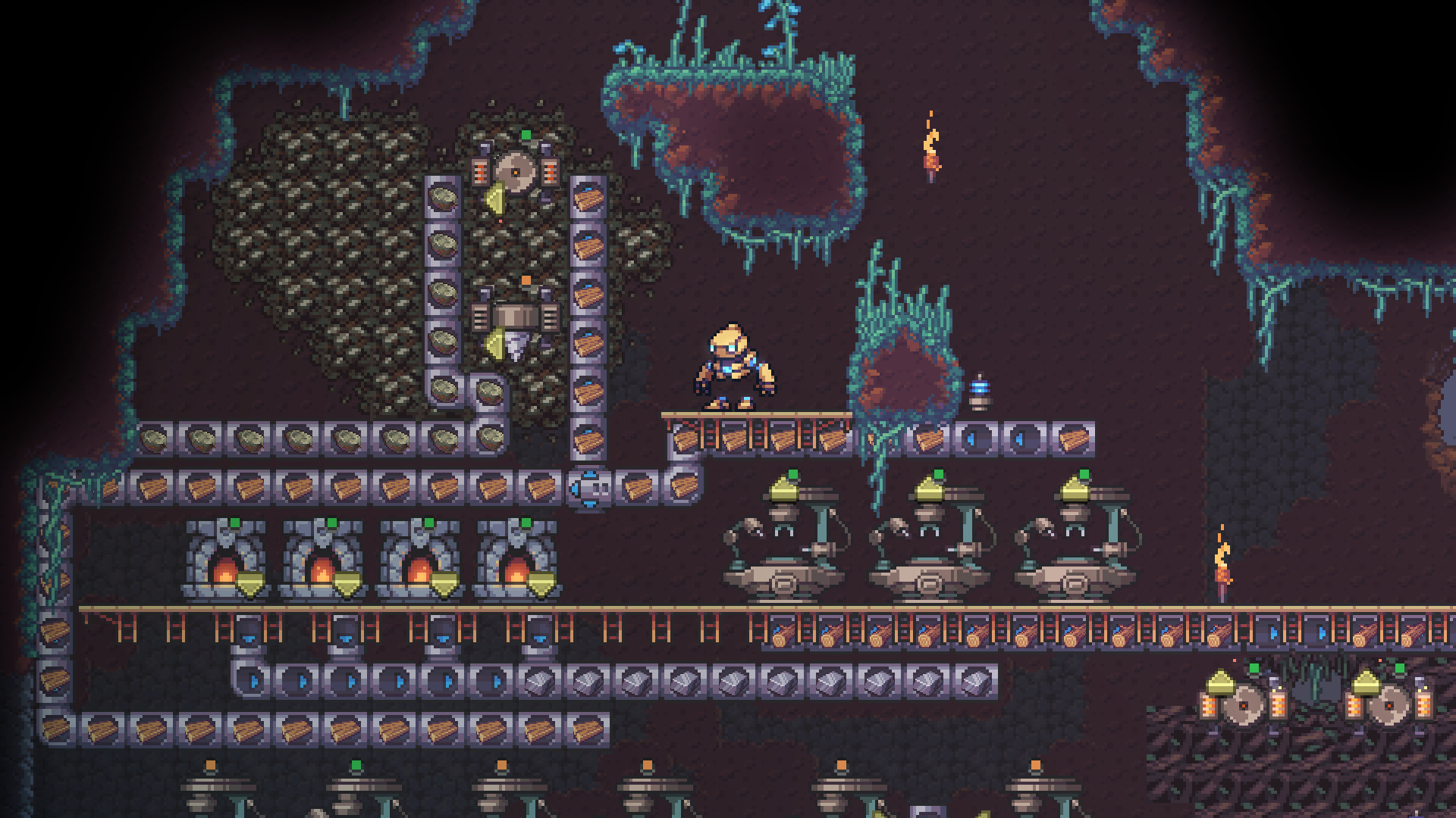 O loop de gameplay incial você conhece muito bem. Colete recursos, explore, comece a usar máquinas para automatizar a obtenção de recursos, estabeleça linhas de produção subterrâneas e depois as expanda para a superfície.