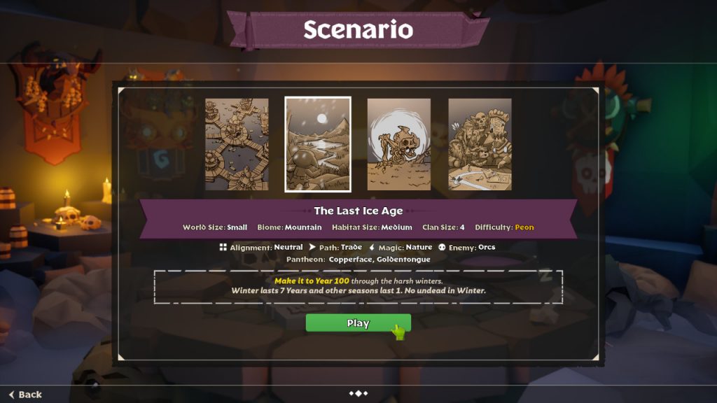 O sistema de cenários foi adicionado a partir do feedback da comunidade que não estava tão contente com o jogo no lançamento. As críticas variavam de “falta de direção” até “fácil demais”. Bom, pelo visto as coisas mudaram já que os cenários variam entre sobreviver 30 dias de noite, 100 dias de constante invasões ou não permitir diplomacia com outras tribos.