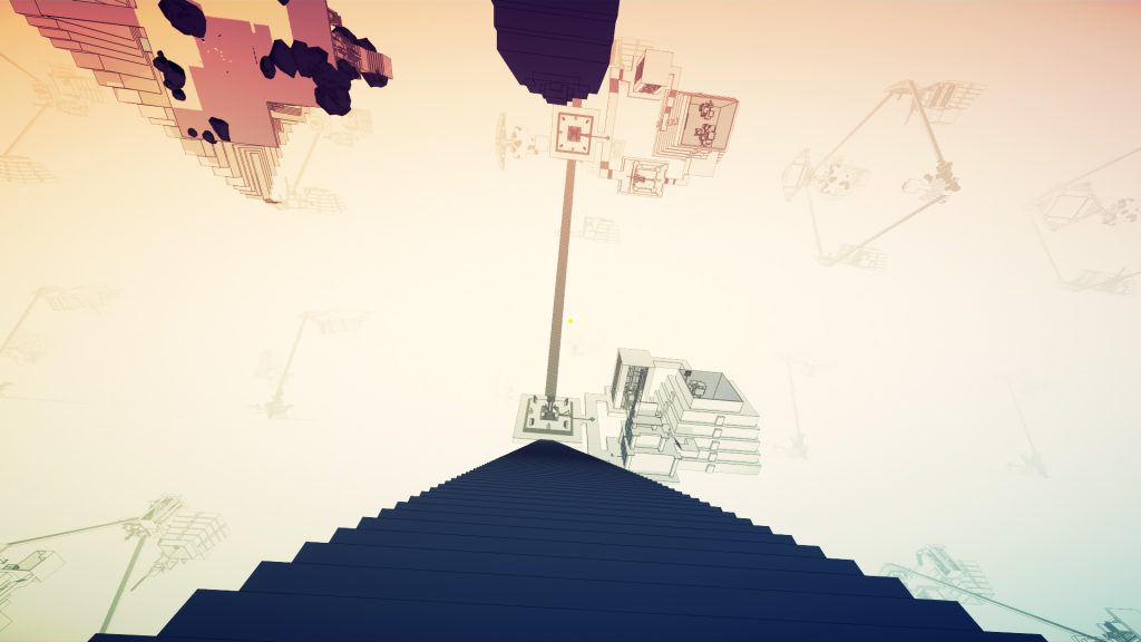 Outro ponto impressionante de Manifold Garden é o uso do seu escopo para expandir o conceito dos quebra-cabeças. Em dado momento eu tinha que alcançar uma plataforma para usar um dos cubos que possuía em mãos e ativar uma nova passagem. Entretanto, o jogo não tem um botão de pulo. Eu tive que me jogar da plataforma – o que bota em jogo o conceito de “labirinto infinito” e esperar que a plataforma que eu desejava alcançar reaparecesse – coisa de 30s, mas que traz um ar de “diferente” nele.