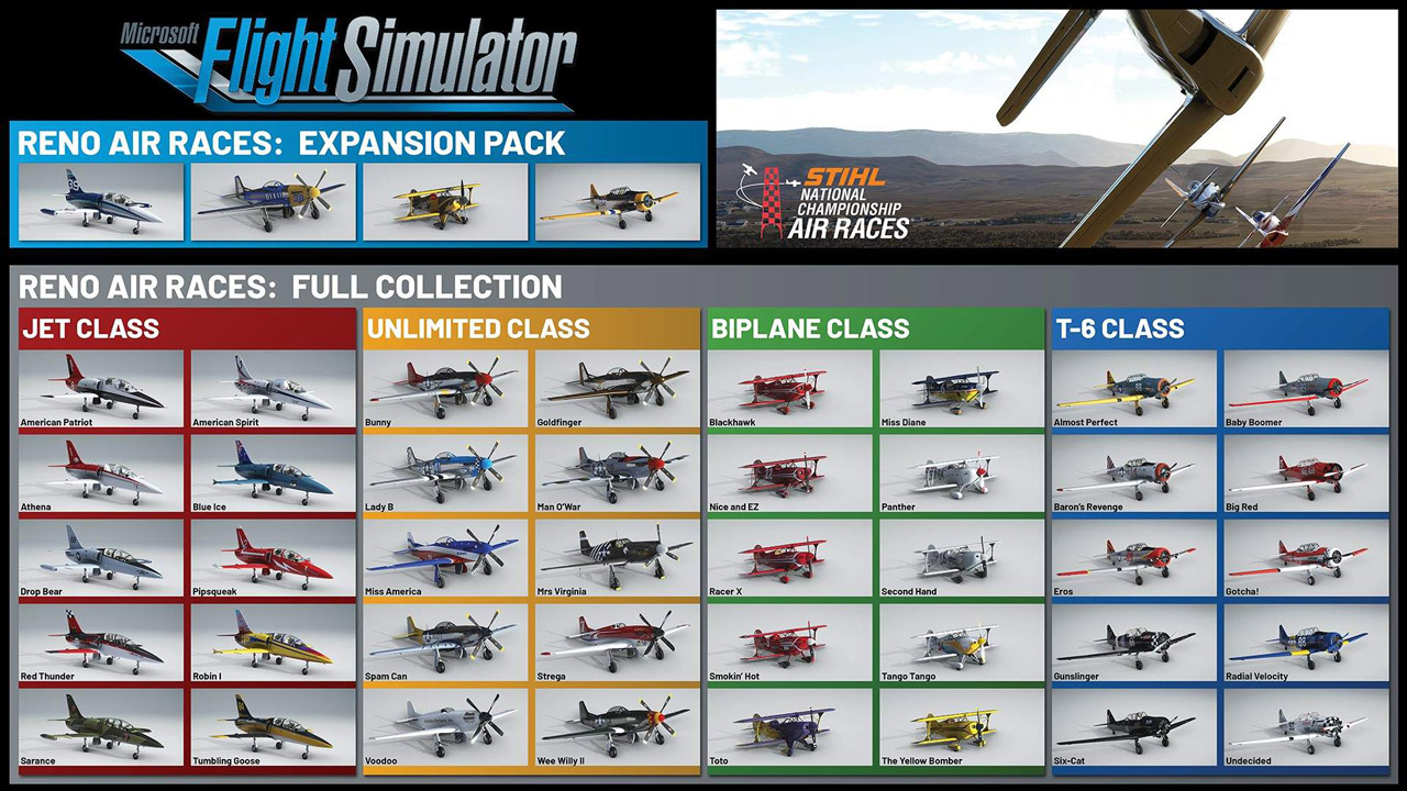 Por fim, a Asobo e a Microsoft anunciaram um novo DLC para o game, o Reno Air Races Expansion Pack. Ele será lançado junto com edição “Game of the Year” e será vendida em dois pacotes. A versão “Expansion Pack” dará acesso a quatro novos aviões — T-6 Texan, a North American P-51 Mustang, an Aero L-39 Albatros, and an Aviat Pitts Special S1S — por US$19,99.