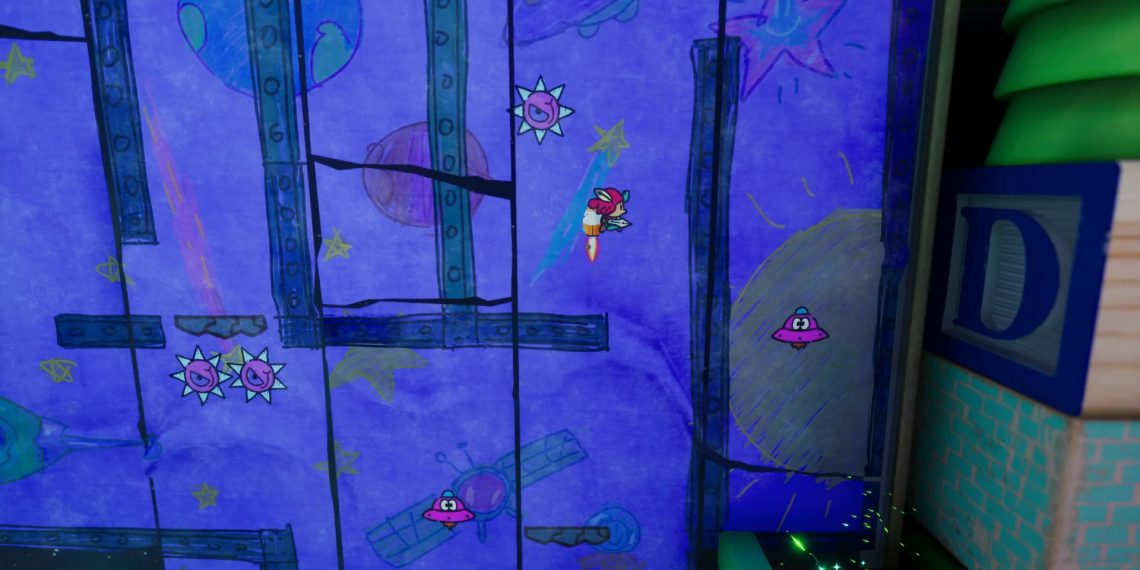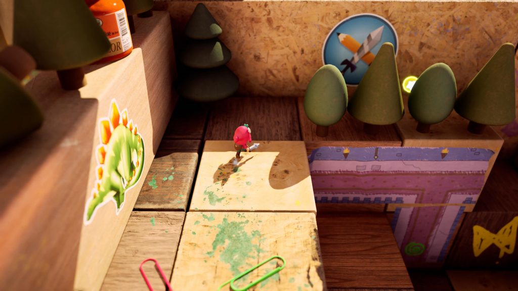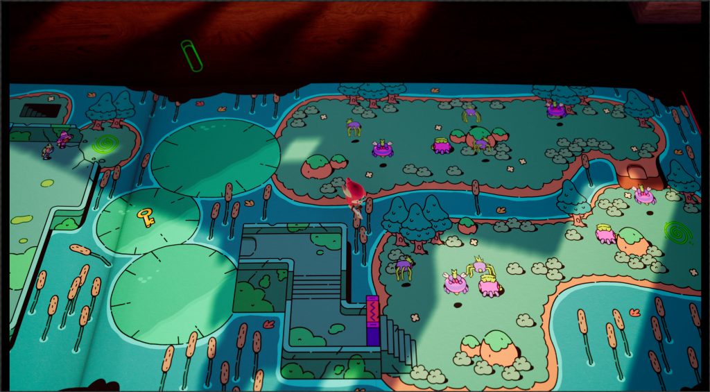 O que chamou a minha atenção e de muitos outros foi como “O Escudeiro Valente” consegue misturar diferentes mecânicas e visuais sem que eles fiquem dissonantes. Uma hora ele está com um visual top down, outra hora vira um jogo de plataforma. Cenários 2D e 3D se combinam em múltiplas fases ao ponto de você começar jogando em cima de uma mesa, pular em um livro, saltar dele e terminar em uma região completamente diferente.