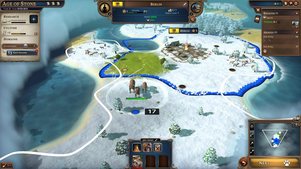 O principal foco dele é expandir o early game, agora com a possibilidade de se ter uma tribo de nômades, novas megafaunas, um novo tipo de terreno gélido. Aqueles que avançarem nas eras terão acesso a um novo tipo de governo, o “Band Society” que dá bônus a curto prazo para tribos que se expandirem rapidamente pelo mapa e construírem uma segunda capital.