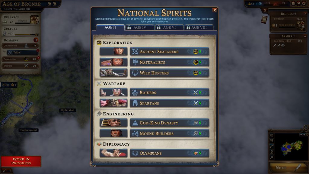 Já a sua civilização é personalizada por meio de um sistema chamado de “National Spirits”. Você precisa definir pelo que a sua nação é famosa e isso vai nortear os seus objetivos e bônus para cada era. As imagens divulgadas mostram os “National Spirits” de Sparta, por exemplo. Entretanto, Sparta só está disponível para o aspecto de combate, ou seja, você também pode alterar o tipo de governo com outra civilização. Outra imagem na galeria abaixo mostra um governo tribal mas com ênfase no combate espartano.