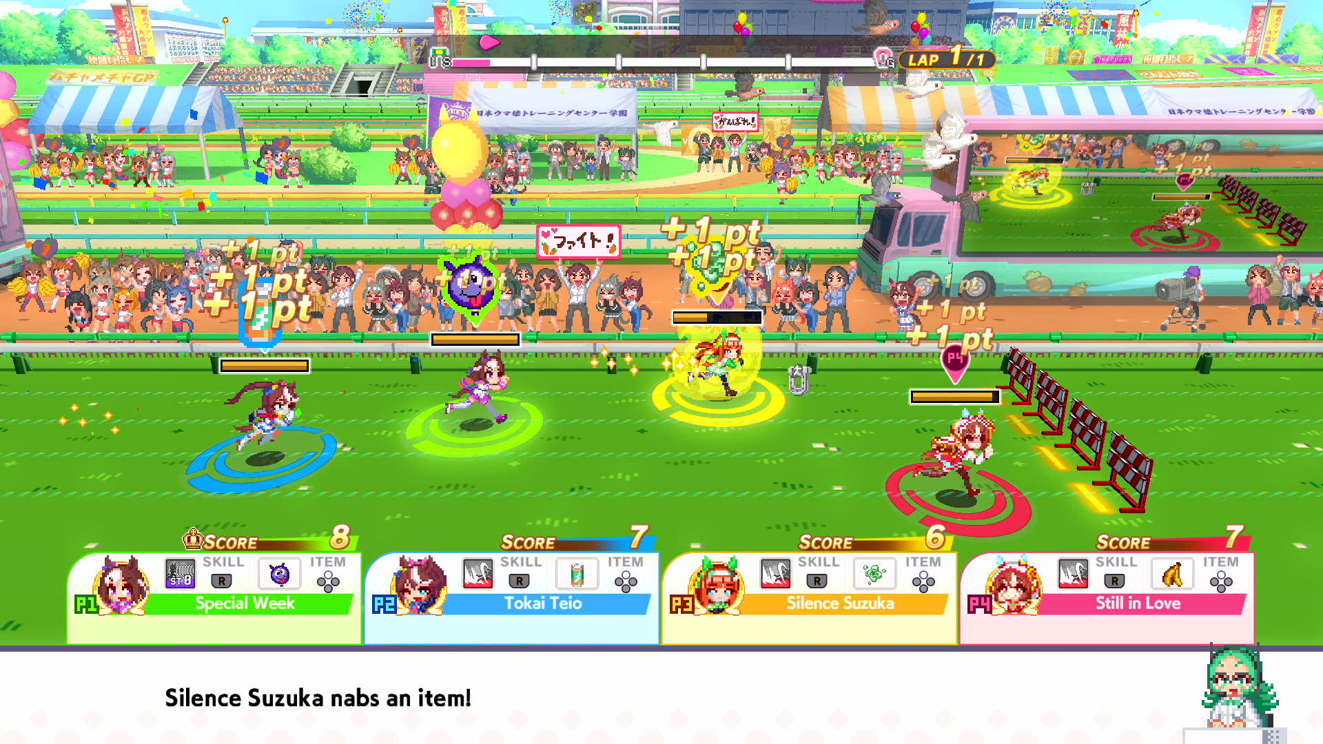 Do que o trailer de lançamento indica, “Umamusume: Pretty Derby – Party Dash” segue uma parte da história do anime, mas se foca bastante em eventos para dois ou mais jogadors. Você pode escolher dentre uma das 25 personagens e jogar minigames como basquete, queimada, corrida com obstáculos e… ver quem come mais?