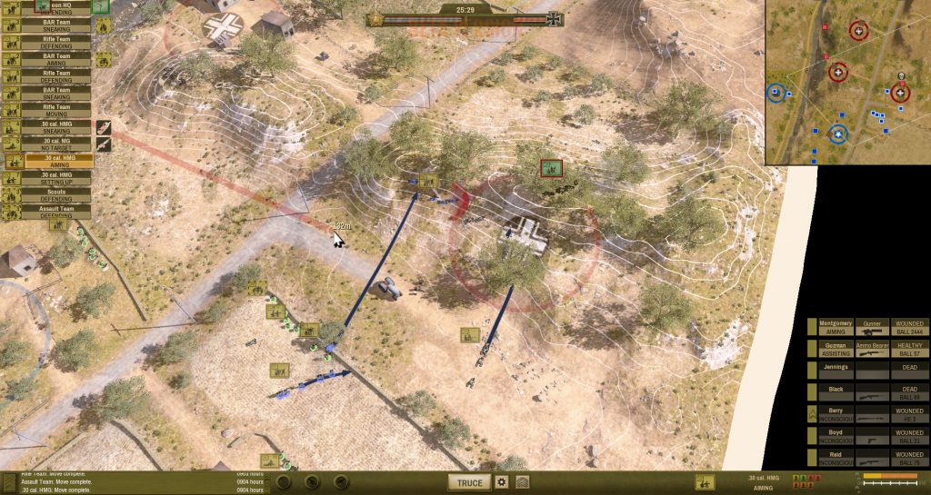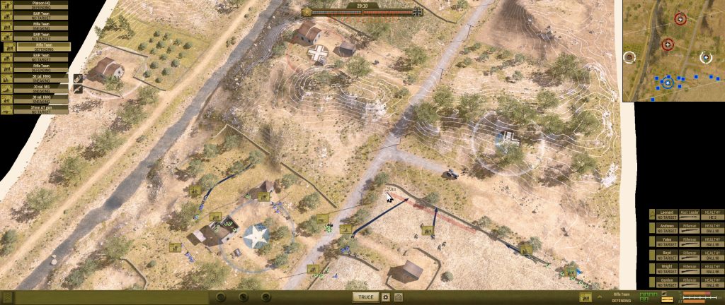 Restou-me apenas a chance das minhas tropas munidas com BAR tomarem a lateral direita do mapa, avançando cautelosamente enquanto a minha única metralhadora ainda na ativa oferecia suporte. Nos minutos iniciais eu senti que havia chegado a um ponto em que poderia mudar o rumo da batalha. Um território conquistado depois, a visão que a equipe BAR tinha do mapa apontava que não havia outras unidades na próxima zona de conquista. Mais um ponto de conquista e eu poderia realizar um cerco na área central do mapa.