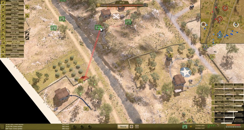 Peguei minhas unidades munidas de rifle e mandei que se movessem pela lateral do mapa, próximo a duas casas e atrás de uma pequena mureta. Foi então que os disparos voltaram. A infantaria italiana, após notar que eu tinha conquistado dois pontos do mapa, rapidamente se mobilizou para defender a área central. Em versões anteriores de Close Combat isso não havia acontecido; a IA raramente se comunicava entre si e na maioria do tempo ficava posicionada no mesmo local desde o começo da partida. A maldita metralhadora voltou a disparar contra os meus soldados. Rapidamente os coloquei contra a mureta (outra funcionalidade implementada em “The Bloody First”) e os mandei usar todas as granadas de fumaça que tinham. Demorei alguns segundos para notar que estavam sem nenhuma. Eles haviam gastado todo o restante no ponto leste do mapa. Para completar, uma artilharia inimiga no fundo do mapa começou a disparar contra eles, eles entraram em pânico e fugiram para trás de uma das casas. Dos 15 ou mais soldados, somente dois sobreviveram.