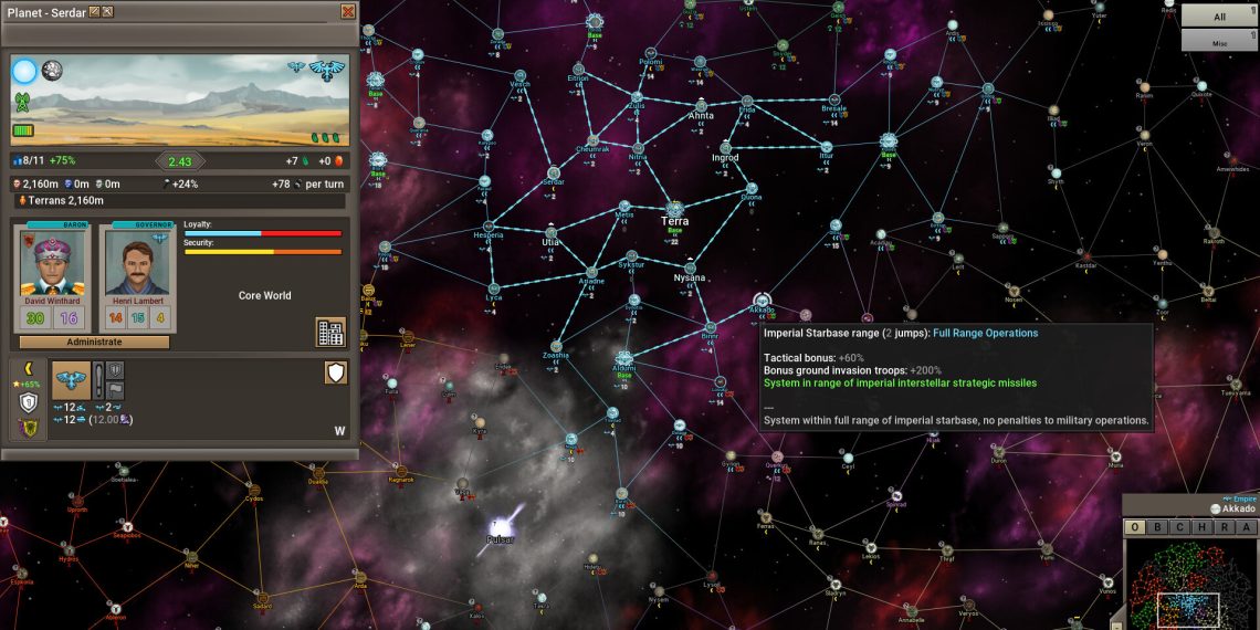 A “graça” do jogo é ver como cada partida se desenrola por meio de dezenas, ou até centenas de eventos, e a forma que você reage vai de uma pequena alteração nas relações até mudanças drásticas nos planetas que você controla. Além do que, o jogo tende a te dar informações “imprecisas” de propósito. Afinal, você está no topo da cadeia de comando e nem sempre tudo chega “completo” para você.