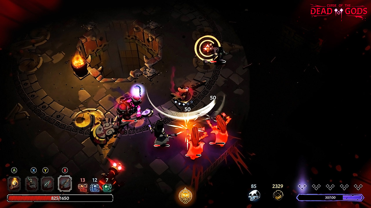 Para compensar a frustração, Curse of the Dead Gods tem uma boa variedade de armas e combos que apesar de simples, são fáceis de aprender e cumprem com a proposta do jogo.