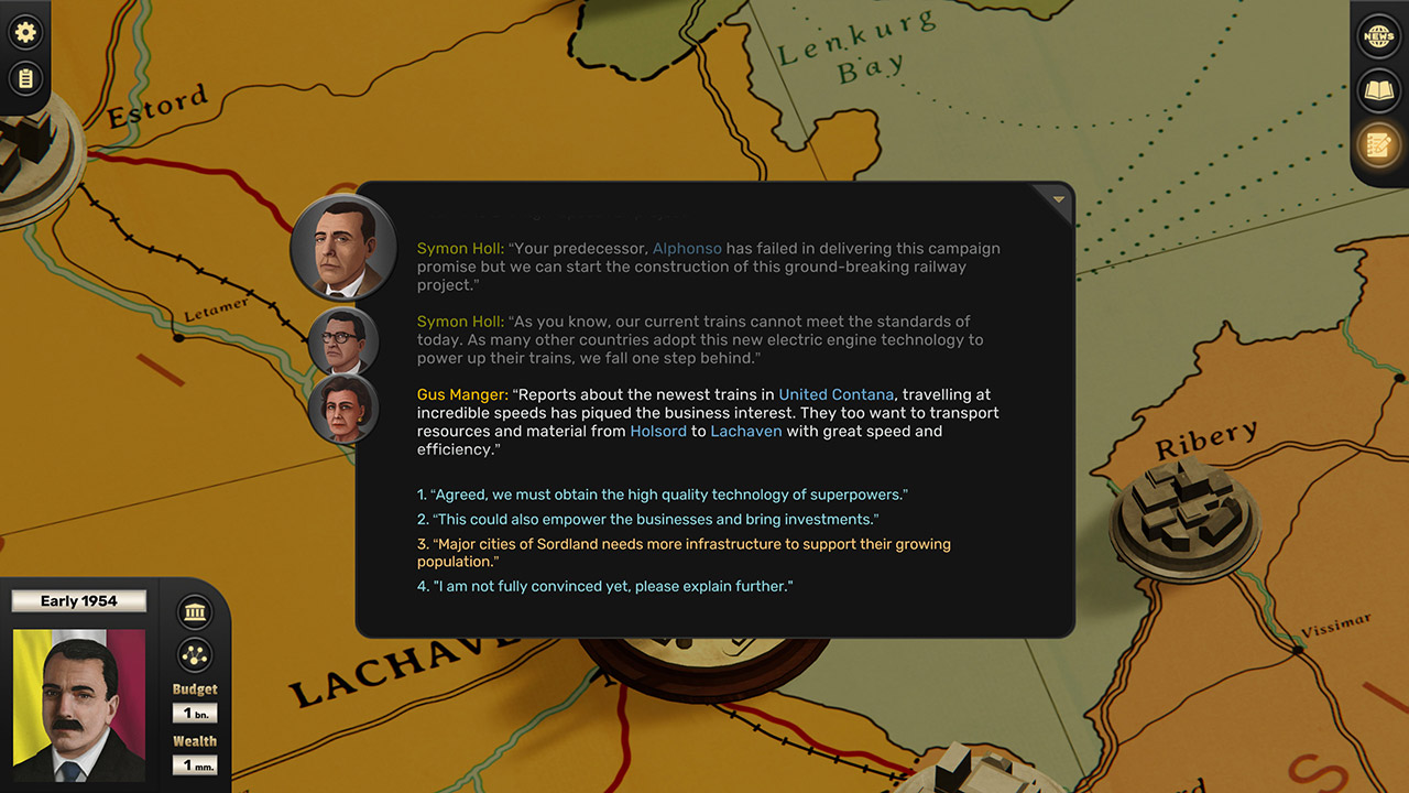 Ele foi eficaz em uma coisa: me deixar tenso o tempo todo. Cada diálogo com um novo membro do meu partido ou uma reunião de gabinete dava a impressão de que o governo ia desmoronar no próximo mês. Estados mudavam de opinião, governadores pediam ajudas que muitas vezes eu não podia dar, possíveis revoltas populares borbulhavam. Não sabia para que lado olhar, como manter o equilíbrio e ainda levar Sordland para um futuro melhor. Caso a narrativa da versão final mantenha o impacto da demo, Suzerain pode garantir um lugar ao lado de Disco Elysium.