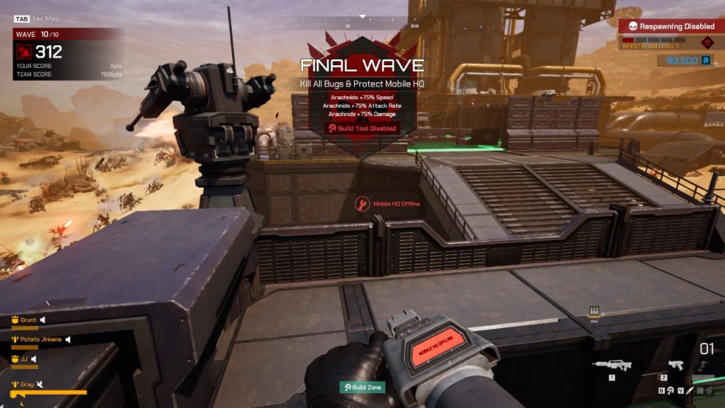 O modo horda é muito mais focado em construir a sua base e defendê-la contra crescentes ondas de inimigos, algo que me apetece muito mais em termos de “partidas rápidas”. Isto é, se é que alguma partida de “Starship Troopers: Extermination” – que dura cerca de 20 a 40 minutos – é de fato rápida.