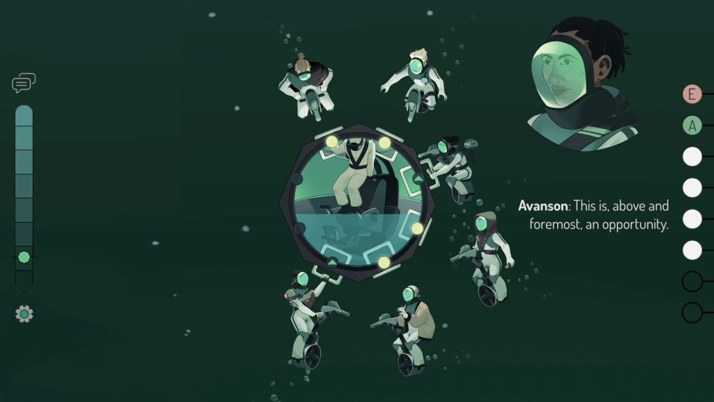 Como mostra o trailer de gameplay, você tem um um número limitados tentativas para tentar conciliar os objetivos da equipe, e ao que tudo indica, isso se estende por cada “capítulo” da jornada até o fundo do oceano. E, diferentes tentativas ou “combinações” equivalem a diferentes respostas dos personagens.
