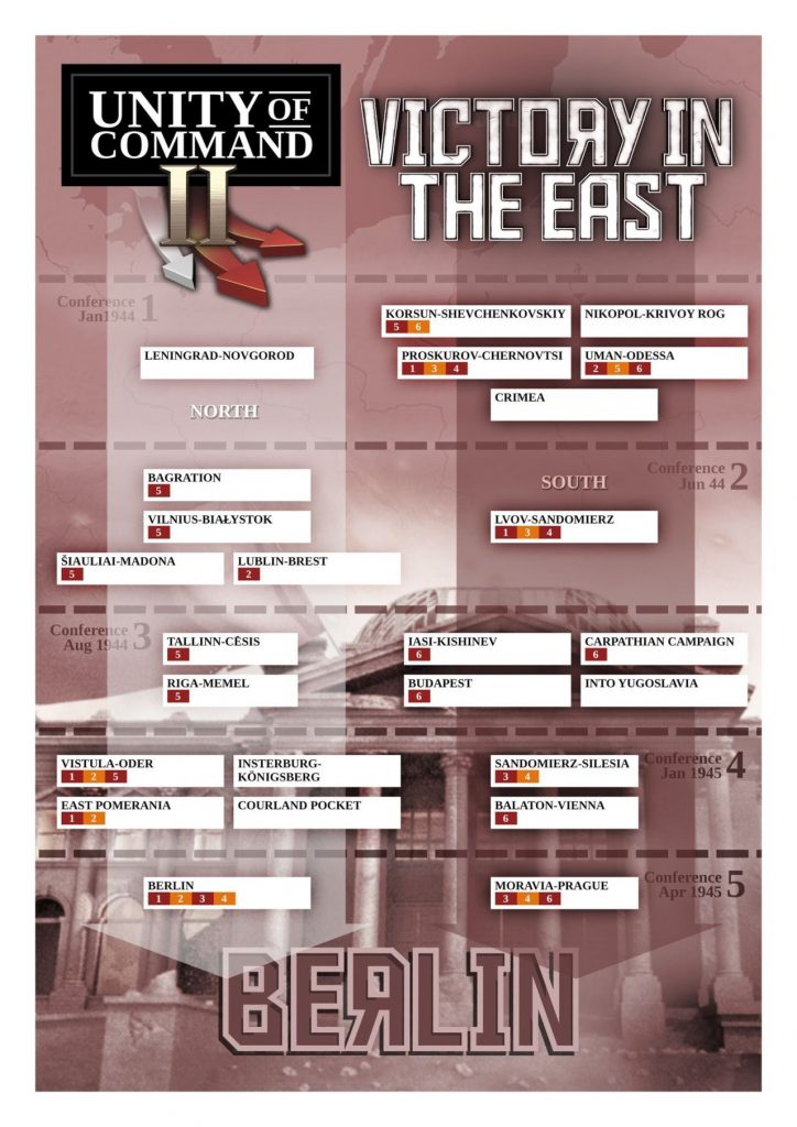 Tal como os outros DLCs de “Unity of Command 2”, as campanhas possuem múltiplas rotas e missões alternativas. A primeira, “Victory in the East” que inclui a operação Bagration começa com a defesa de Leningrado no Norte e avança pra Bagration, Pomerânia e se estende até o avanço em Berlim. Alternativamente, o jogador pode ir ao Sul pela Crimea e avançar até Praga.