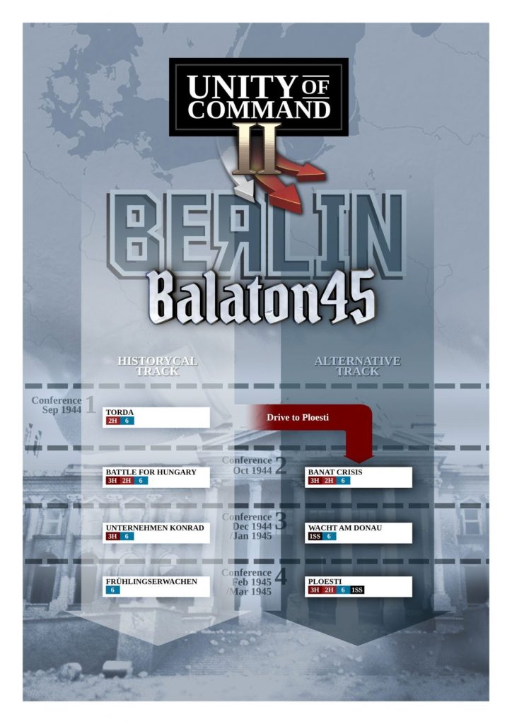 Já a campanha alemã começa em Torda em 1944, continua pela Hungria até março de 1945. O caminho anistórico segue uma invasão até Ploesti com três missões adicionais.