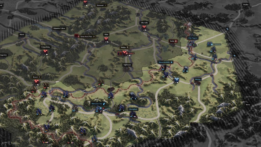 Já a campanha alemã começa em Torda em 1944, continua pela Hungria até março de 1945. O caminho anistórico segue uma invasão até Ploesti com três missões adicionais.