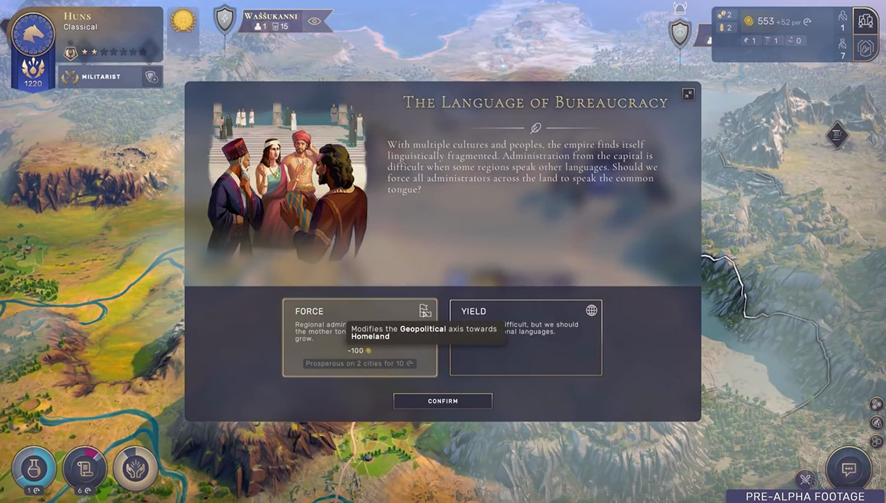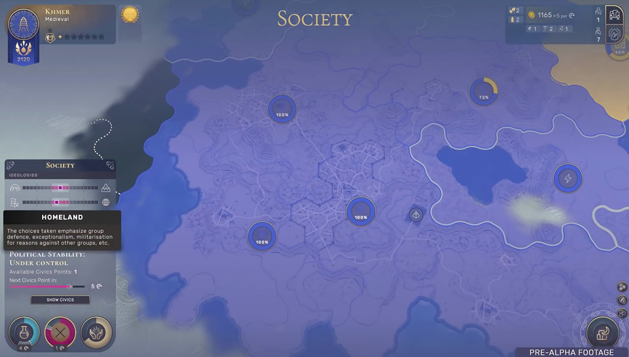 Esses eixos são estabelecidos a partir de decisões e escolhas cívicas. No vídeo publicado é possível ver opções como “como devemos lidar com o aspecto de liderança dentro de cidades?” e vários sliders para ajustar diferentes componentes dentro do conceito de liderança.